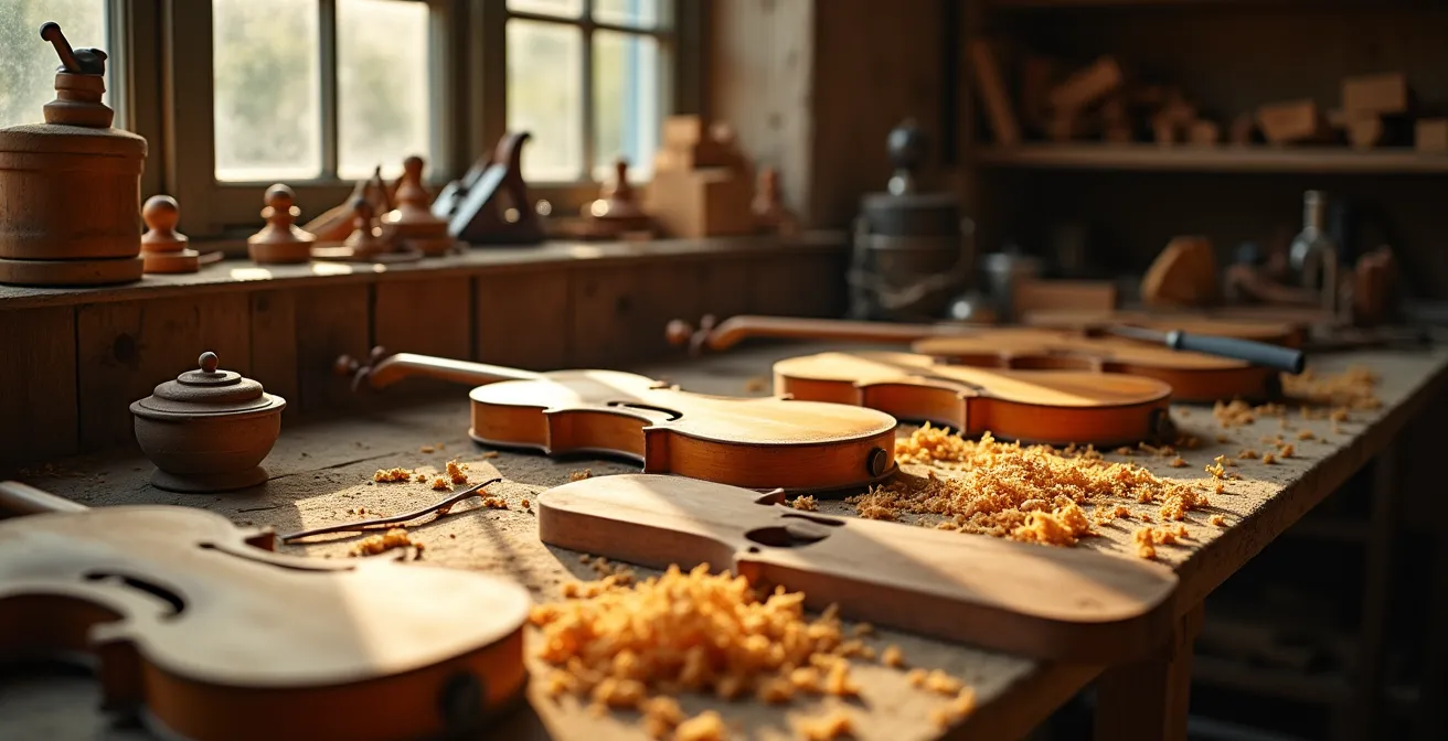 La fabrication d’un violon est l’incarnation parfaite de l’union entre science des matériaux et art séculaire. Chaque étape, du choix du bois à la pose du vernis, est une décision acoustique. Le processus commence par la sélection de l’épicéa pour la table d’harmonie et de l’érable ondé pour le fond, les éclisses et le manche, pour les raisons de rigidité et de densité que nous avons explorées. Mais la matière brute n’est rien sans la main qui la sculpte. Le luthier ne se contente pas de suivre un plan ; il « écoute » le bois à chaque étape, l’affinant pour en extraire le potentiel sonore maximum.