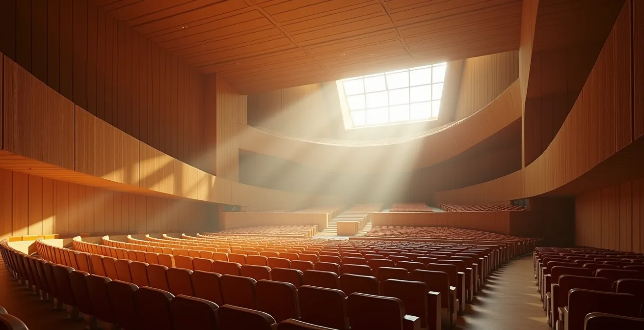 La forme d’une salle de concert est loin d’être un simple choix esthétique ; elle est le premier facteur qui sculpte son identité sonore. Historiquement, le modèle dominant était la « boîte à chaussures » (shoebox), comme le Musikverein de Vienne. Ces salles longues et rectangulaires favorisent les réflexions sonores latérales, qui arrivent aux oreilles de l’auditeur juste après le son direct. Ce léger décalage crée une sensation d’enveloppement et d’ampleur sonore très appréciée pour la musique classique. L’inconvénient est que les spectateurs les plus éloignés peuvent percevoir le son avec un retard et une perte de clarté importants.